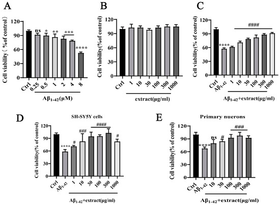 A. annua extract reduced the neurotoxicity triggered by Aβ1–42. (A) Assessment of Aβ1–42 cytotoxicity. Cells were treated with different concentrations of Aβ1–42 (0.5–8 μM) for 24 h and cell viability was assessed using the MTT assay. (* p < 0.05, ** p < 0.005, *** p < 0.0005, **** p < 0.0001 were considered as statistically significant, * representative comparison between Ctrl and Aβ1–42, ns was not considered significantly different). (B) Assessment of extract neurotoxicity. Cells were treated with different concentrations of extract (1–1000 μg/mL) for 24 h and cell viability was measured using the MTT assay. (C) Assessment of the effect of extract treatment on Aβ1–42-induced neurotoxicity. Cells were incubated with 8 μM Aβ1–42 and treated with different concentrations of extract for 24 h and cellular viability was assessed using the MTT assay. (D) Cellular viability of SH-SY5Y cells treated with 8 μM Aβ1–42 alone or with (1~1000 μg/mL) extract. (E) Cellular viability of primary neurons treated with 8 μM Aβ1–42 alone or with (1~1000 μg/mL) extract. Each assay was performed in triplicate and the experiment was repeated three times. (**** p < 0.0001; # p < 0.05, ### p < 0.0005 and #### p < 0.0001 were considered statistically significant; ns was not considered significantly different. * Representative comparison between Ctrl and Aβ1–42; # representative comparison between Aβ1–42 and extract).