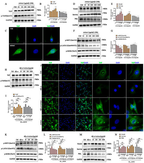 A. annua extract’s protective effect occurs via regulating YAP signaling in PC12 cells. PC12 cells were treated with (30 μg/mL, 100 μg/mL, 300 μg/mL and 1000 μg/m) extract for 24 h. (A) Western blot analysis of YAP, P-YAP2 and GAPDH expression. (B) Quantification of A, extract increased the expression of YAP and decreased the phosphorylation of YAP in a dose-dependent manner. (C) Immunofluorescence of YAP (scale bars 5 μm). (D) The expression of TEAD2, Survivin, PML and GAPDH were detected by western blot. (E) Quantification of western blot from (D), extract promoted the expression of TEAD2 and Survivin in PC12 cells, and decreased the expression of PML. (F) Western blot analysis of p-MST1(Ser410), p-LATS1/2(Ser909/872) and p-MOB1(Thr35) expression. (G) Quantification of western blot from (F), extract inhibited the phosphorylation of MST1 and LATS1/2, while no effect the expression of p-MOB1(Thr35). (* p < 0.05, ** p < 0.005 and *** p < 0.0005 were considered statistically significant. * Representative comparison between Ctrl group and extract groups). (H) PC12 cells were incubated with 8 μM Aβ1–42 with or without extract at different concentrations for 24 h. Western blot analysis of the effect of extract on YAP, p-YAP and GAPDH. (I) Quantification of western blot from (H). (J) Immunofluorescence of YAP expression (scale bars 20 μm and scale bars 5 μm). (K) Western blot analysis of p-MST1(Ser410), p-LATS1/2(Ser909/872), p-MOB1(Thr35) and GAPDH expression. (L) Quantification of western blot from (K). (M) Western blot analysis of TEAD2, Survivin, PML and GAPDH. (N) Quantification of western blot from (M). (* p < 0.05, ** p < 0.005 and *** p < 0.0005; # p < 0.05, ## p < 0.005 and ### p < 0.0005 were considered statistically significant; ns was not considered significantly different. * Representative comparison between Ctrl and Aβ1–42, # representative comparison between Aβ1–42 and extract).