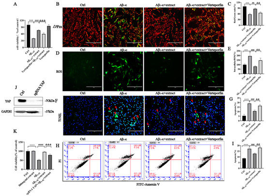 To further verify whether YAP is associated with the survival effect promoted by extract against Aβ1–42-induced cell apoptosis, the cells were pretreated with verteporfin (a specific inhibitor of YAP) for 60 min at a concentration of 2.5 μM [48] followed by incubation with extract and Aβ1–42 for 24 h. MTT assay results showed that verteporfin at a concentration of 2.5 μM blocked the neuroprotective action of extract against Aβ1–42-induced neurotoxicity (Figure 10A). Incubation of cells with verteporfin for 60 min prior to Aβ1–42 alone or with extract prevented the recovery of the mitochondrial membrane potential (Figure 10B,C) and the decrease in intracellular ROS levels promoted by extract (Figure 10D,E). TUNEL staining and flow cytometry results showed that verteporfin also blocked the inhibitory effect of extract against Aβ1–42-induced cell apoptosis (Figure 10F–I). YAP knockout using Crispr Cas9 approaches further confirmed the involvement of YAP signaling on the extract’s neuroprotective effect. After confirmation of the successful knockout of YAP on PC12 cells by Western blot analysis (Figure 10J), the cells were incubated with 8 μM Aβ1–42 with or without extract for 24 h. MTT assay results confirmed that the neuroprotective effect of extract was blocked in the KO cellular model (Figure 10K), further validating the involvement of YAP signaling in the protective effects of extract against Aβ1–42-induced toxicity.