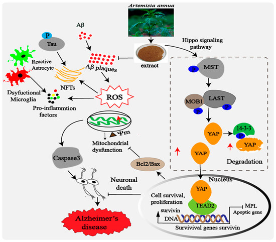 AD is an intricate multifactorial disease caused by an interaction between genetic and environmental factors [49]. Despite extensive research, there is still no effective treatment able to halt the development or progression of this disease, whose worldwide incidence has been continuously increasing. Therefore, we propose that a therapeutic approach able to target multiple pathways to stop the different signaling cascades driving AD pathogenesis including Aβ aggregation, Tau phosphorylation, oxidative stress and mitochondrial dysfunction could pose as an effective strategy. A. annua-derived compound artemisinin and its analogue artemether have been associated with a broad spectrum of neuroprotective actions, holding encouraging prospects for future AD therapies [50,51]. However, the potential therapeutic effect of A. annua on the cognitive impairments and pathological changes observed during AD are still not known. In the present study, we described for the first time the potential of the extract to significantly improve 3xTg AD mice’ cognitive deficits, reduce Aβ accumulation, hyper-tau-phosphorylation and the release of inflammatory and apoptotic factors. Moreover, the extract promoted the survival and proliferation of neural progenitor cells (NPs), increased the expression of synaptic proteins and inhibited neuronal cell death while stimulating the activation of the Hippo signaling pathway. In this study, we also reported that extract was able to protect neuronal cells against the neurotoxicity induced by Aβ1–42 by promoting cell survival, restoring the mitochondrial membrane potential loss, inhibiting ROS overproduction and attenuating Aβ1–42-induced apoptosis. It also stimulated the increase in YAP expression while decreasing YAP phosphorylation, suggesting the involvement of the Hippo/YAP signaling pathway in the mediation of its protective effects.