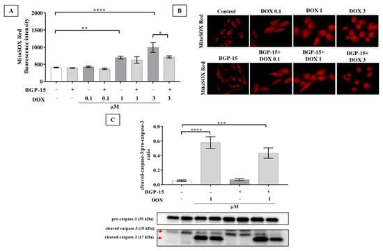 2.2. BGP-15 Attenuates the DOX-Induced Generation of Mitochondrial ROS and Slightly Diminishes the Activation of Caspase-3 Apoptosis Marker in H9c2 Cells