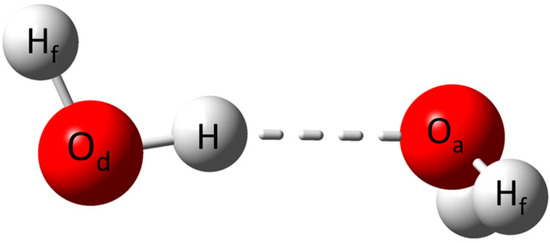 The clusters adopted in the present study correspond to the models previously employed by Řezáč et al. [40], which have been recognized to provide an adequate representation of the water system. The atoms of each cluster involved in the HB interaction were denoted as Od–H⋯Oa, referring to donor and acceptor oxygen atoms, as depicted in Figure 1. This notation will be upheld along the discussion. To understand the differences between the HBs formed in each cluster, the geometrical aspects of all the clusters are to be described. Moreover, for the sake of clearness, the models are divided into two subgroups: (i) 2-D clusters comprising the cyclic clusters (H2O)n, with n = 3–6 and (ii) 3-D clusters comprising the cage-like clusters (H2O)n, this being exclusively for n = 6–7.