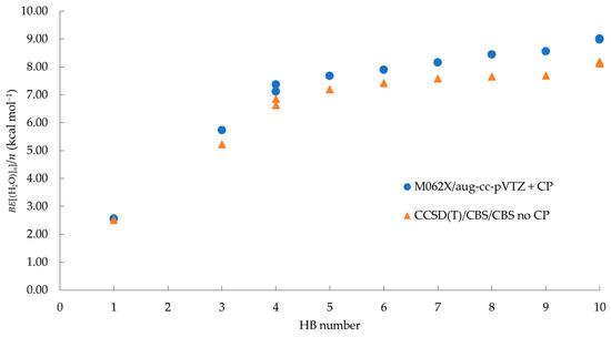 From Table 1, it can be noticed that our counterpoised corrected binding energies computed at the M062X/aug-cc-pVTZ level are comparable with the values obtained at CCSD(T)/CBS/CBS level reported in Ref. [46], a fact that validates the method employed in the present study. It is also observed in Table 1 that the BE per water molecule increases with respect to the number of molecules of the system, as expected. Although the latter definition of BE is customarily used to describe the energetic features of molecular aggregates, in the case of water clusters, it is also interesting to consider the BE per HB, because it provides an average of the stabilization energy gained per HB formed in each system. As reported in Table S2 (see Supplementary Materials), the BE per HB systematically increases with the system size for the case of 2-D cyclic clusters. However, when the more complex 3-D structures are considered, this value decreases as the number of HBs increases. The latter is particularly clear in the hexamers, where, given a fixed number of molecules (i.e., n = 6), the HBs go from 6 to 9. The data summarized in Table S2 shows that the BE per HB is 7.90 in the 2-D cyclic cluster 6a, whereas this quantity decreases to 5.71 in the 3-D cluster 6d. The last result allows us to conclude that the more complex the geometrical arrangement of the cluster, the lower the average contribution of each HB to the total energy of the system, suggesting that, while in 2-D structures the HBs formed are equivalent, in the 3-D systems a larger diversity of HBs can be expected.