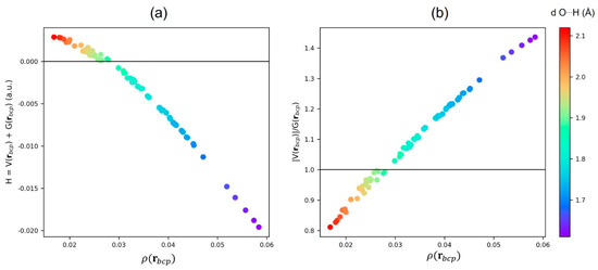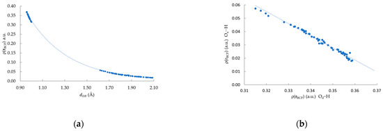In all the clusters, two different BCPs can be found, one corresponding to the covalent Od–H polar bonds and the second related to the non-covalent HB interaction Oa⋯H, following the notation depicted in Figure 1. As we mention before, the uniqueness of the BCP allows the characterization of the whole bond in terms of different properties of . Figure 4a depicts the dependence with the two oxygen-hydrogen interatomic distances; namely: Od–H and Oa⋯H. From Figure 4, two sets of points are clearly identified, one at shorter distances, associated with the Od–H bonds, and the other one, at larger distances, corresponding to the Oa⋯H HBs. Moreover, these vs. points fit an exponential function [, ]. This result shows that both types of bond Od–H and Oa⋯H fit an empirical model previously reported for other systems [52,53]. From Figure 4b, an inverse relationship between the value computed at the Od–H BCP and its Oa⋯H counterpart is observed. This last result suggests that a charge transfer occurs from the covalent Od–H bond to the Oa⋯H HB. It is important to comment that this has also been observed in other systems characterized by N−H⋯N and F−H⋯F HB interactions [18,54].