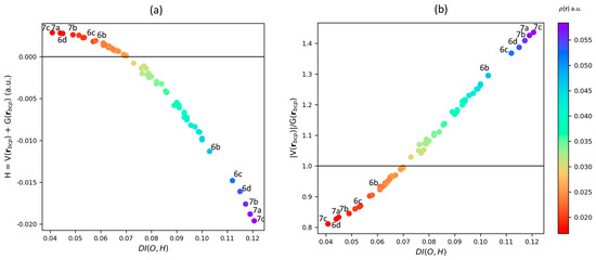 (a) Relationship between (a.u.) with the H⋯Oa DI (a.u.) and (b) Relationship between (a.u.) with the H⋯Oa DI. The color scale it related to the HB (a.u.).