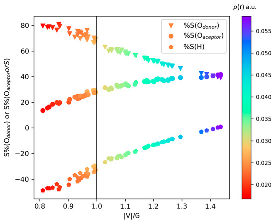 Figure 7 shows the atomic source contribution for all the HB in the considered clusters plotted against the ratio , where it can be seen that and increase with the value, whereas decreases until it becomes roughly equal to . The values span the 44.3–66.17% range for pure closed-shell interactions region, i.e., , with the remaining contributions coming from atoms not directly participating in the HB. On the other hand, in the transit region, i.e., , the contributions of the Od−H⋯Oa triad ranges from 66.19% to 81.84%. It is worth noting that an increase in the percentage contribution of the triad Od−H⋯Oa can be directly related to an increase in the ratio , which, in turn, can be associated to an increase in the interaction’s shared-shell nature.