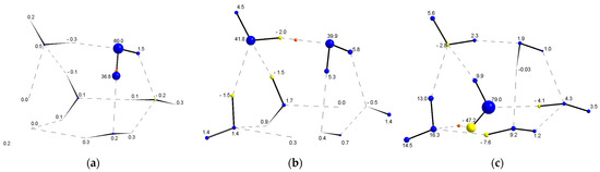 The SF was employed also to unveil the character of the HBs in 3-D clusters. This analysis was focused on the 3-D cluster 6d as a representative case, because it contains HBs that belong to the pure closed-shell and the transit regions, as shown by the evaluation of , , and DI(O,H) (see tables in Supplementary Material). In this case, the SF was employed to examine the localized/delocalized character of the atomic contributions to the of the Oa⋯H interaction. These atomic contributions are calculated by integrating the local source, , on the atomic basin (see Equations (7)–(9). It is important to mention that, since the topography of the electron density at any location in space affects the electron density at the Oa⋯H BCP, the atomic SF contribution can be used as an alternative to explore electron delocalization [64,65,66,67]. Figure 8 displays a pictorial description of the atomic source contributions to the electron density at the BCP of different bonds and interactions. For the Od–H covalent bond, depicted in Figure 8a, the contributions of the atoms that form the bond account for 96.8% of the electron density at the BCP, whereas 1.5% of the electron density refers to the other H atom in the molecule and 1.7% corresponds to the remaining atoms in the cluster. In a strong HB (see Figure 8b), a similar behavior is exhibited, where the atomic SF contribution of the interacting atoms, , is 79.7% and 20.3% is spread along the rest of the water molecules. On the other hand, Figure 8c shows the atomic SF contributions for a weak HB (i.e., ), where the SF triad contribution is only 48.1%, and the remaining 51.9% contribution is associated to the remaining atoms in the cluster. The latter observations mean that as the shared-shell character of the HB increases, the SF contributions become more localized and vice versa.
