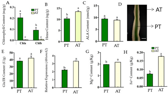 The porphyrin metabolism characterizes in the central photosynthetic tissue (PT) and marginal albino tissue (AT) of the chimeric leaves of Ananas comosus var. bracteatus. Chlorophyll content (A), heme content (B), 5-aminolevulinic acid content (C), Chimeric leaf (Photosynthesis tissue (PT) and marginal Albino tissue (AT) at 100 µm scale bar (D), GluTR content (E), Relative expression of AbHemA2 (F), Mg2+ content (G), and Fe2+ content (H). The bars show how each bar differs from the others. The means denoted by the same letter did not differ significantly at p < 0.05.
