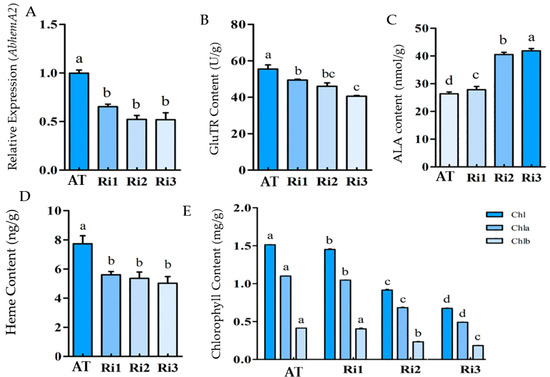 The expression of hemA in the three transgenic tobacco lines (Ri1, Ri2, and Ri3) was significantly lower than the wild type (p < 0.05) (Figure 4A). It was confirmed that the expression of hemA was inhibited effectively. The GluTR content of the transgenic plants decreased significantly as hemA gene expression decreased (Figure 4B), indicating that hemA expression regulation affected GluTR content. It was worth noting that the ALA content of the transgenic plants increased significantly (about 1.5 times to that of the wild type) (Figure 4C), which was not in accordance with the decreasing hemA expression and GluTR content. However, the chlorophyll and heme content of the transgenic plants were significantly lower than that of the wild type (Figure 4D,E). The increased accumulation of ALA (<1.5 times) in the transgenic plants resulted in a greater decrease in chlorophyll biosynthesis, while the heme content remained at a relatively stable lower level.