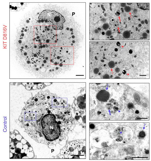 The KIT D816V iPS cell-derived MCs obtained via our protocol recapitulate phenotypic features of SM MCs, such as abnormal expansion and aberrant surface expression of CD25 and CD30. Furthermore, mutant MCs showed higher FcER1 surface expression in comparison to control cells. The gene coding for MRGPRX2, a pivotal receptor in non-IgE-mediated MC activation and responsible for the connection between MC-mediated immune regulation and neurologic stimuli, showed higher expression in KIT D816V MCs than in control MCs [47]. TEM analysis of iPS cell-derived MCs revealed MC typical cytoplasmic secretory granules and indicated a more activated degranulating status of KIT D816V MCs. The observation of large membrane delimited structures with low granule content, more abundant in KIT D816V MCs, suggests the occurrence of piecemeal degranulation, a process of MC degranulation upon activation commonly observed under inflammatory conditions [3]. Altogether, our data indicate a more activated status of KIT D816V MC, in agreement with SM clinical features [51].