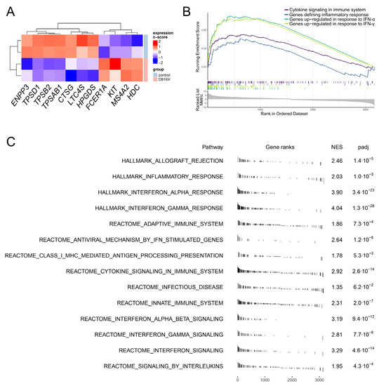 KIT D816V iPS cell-derived MCs display inflammatory and immune response transcriptional profile. (A) Global gene expression analysis of KIT D816V (n = 2) and control (n = 2) iPS cell-derived MCs confirmed MC identity as 11 out of 14 MC signature genes were highly expressed (please also see Supplemental Figure S3A). KIT D816V MCs showed higher expression of KIT and FcER1 subunits FCER1A and MS4A2. Gene expression z-score is plotted as a heatmap. (B) Gene set enrichment analysis (GSEA) of iPS cell-derived MC transcriptome revealed an upregulation of pathways related to cytokine signaling in the immune system, inflammatory, and IFN-α/β/γ responses in KIT D816V cells. (C) Enriched pathways in KIT D816V MC expression profile identified by GSEA. KIT D816V MCs show upregulated pathways related to innate and adaptive immune system as well as inflammatory response, IFN, and cytokine signaling, among others. The gene set names, with respective gene set collection names, are listed with the normalized enrichment score (NES) and adjusted p-value (padj).