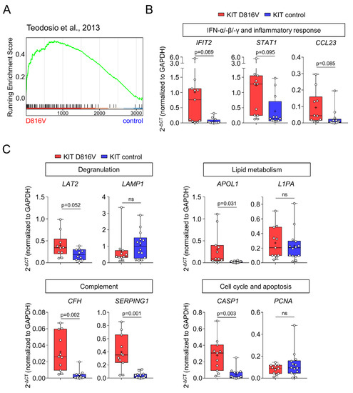 KIT D816V iPS cell-derived MCs recapitulate the transcriptional profile observed in primary SM MCs. (A) Gene sets, identified to be deregulated in primary BM MCs of SM patients in the work of Teodosio and colleagues [48], are enriched in KIT D816V iPS cell-derived MCs, as shown by GSEA. (B) Validation of the GSEA by RT-qPCR. Upregulation in IFN signaling pathways was validated by IFIT2 and STAT1 gene expression, and upregulated inflammatory response pathway was validated by CCL23 gene expression. (C) RT-qPCR validation of additional upregulated pathways identified in our GSEA and by Teodosio and colleagues. For (B,C), box and whiskers plots show minimum and maximum values; “+” indicates the mean value, and statistical analysis is performed with Welch’s t-test (KIT D816V n = 10–11, control n = 10–14). ns indicates not significant.