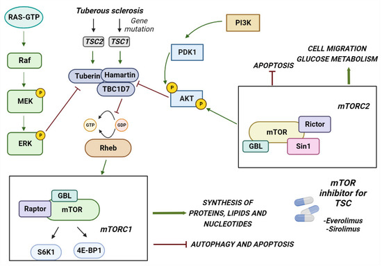 TSC is caused by mutations in two genes, the TSC1 gene located on chromosome 9 (9q34), which encodes the hamartina protein, and TSC2 located on chromosome 16 (16p13.3), which encodes the tuberin protein [37,38]. TSC1 mutations have been identified in ~10–20% of patients, whereas TSC2 mutations have been identified in ~70–90% of patients clinically diagnosed with TSC [39,40]. The proteins produced by these two genes physically interact with high affinity to form a heterotrimeric complex, termed the TSC protein complex, with the TBC1 domain family member 7 (TBC1D7), [41,42] and act on the signaling pathway of mTORC1 (rapamycin complex 1), a serine/threonine kinase involved in many cellular processes, such as cell growth, proliferation, and response to extracellular stress [43,44,45]. The major driver of the cellular hyperplasia and tissue dysplasia seen in TSC is the overactivation of the mTORC1 signaling pathway. Under normal conditions, growth factors stimulate the PI3K (phosphatidylinositol 3-kinase) and Ras–MAPK (mitogen-activated protein kinase) pathways, thereby inhibiting the TSC protein complex and activating mTOR signaling (Figure 1) [46,47]. mTOR acts through two complexes, mTORC1 and mTORC2. The loss of function of TSC genes results in an increase in mTORC1 and a decrease in mTORC2 signaling [48]. The mechanism by which this occurs is not clear; it is probably due to loss of direct binding of the amartin/tuberin complex to mTORC2. Alternatively, increasing mTORC1 activates a negative feedback loop from p70S6K inhibiting IRS-1 by inhibiting the PI3-kinase-dependent activation of mTORC2.