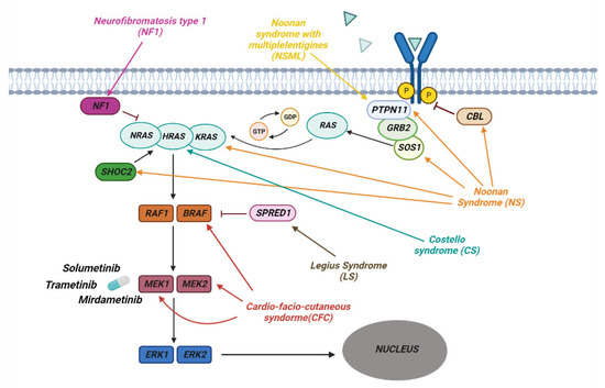 The pathway of RAS/MAPK in RASopathies. The figure shows how the various genes of the Ras/MAPK pathway are involved in the development of the different syndromes associated with RASopathies. Shown are some of the MERK1/2 kinase inhibitors used to treat RASopathies, some of which are FDA-approved.