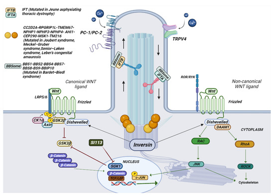 Canonical and non-canonical Wnt pathways. The canonical and noncanonical Wnt pathways are depicted in the figure with the various genes and mechanisms that are activated. In ciliopathies, several studies have shown that this pathway plays an essential role in their onset. Si113 is indicated; an SGK1 kinase inhibitor appears to have an effect on hydrocephalus caused by some ciliopathies.