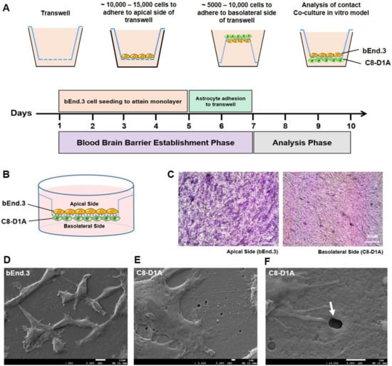 The establishment of a co-culture in vitro BBB model. (A) Schematic timeline representation of bEnd.3 and C8-D1A cell seeding on apical and basolateral sides of the transwell to attain a contact co-culture in vitro BBB model. (B) Graphical representation of intact contact co-culture in vitro BBB model. (C) Hematoxylin and eosin (H&E) stained transwell membrane shows adherent bEnd.3 and C8-D1A cells on the apical and basolateral side. (D–F) Scanning electron micrographs of transwell membrane at low confluency of cells show (D) bEnd.3 cells on the apical side (×950) and (E) C8-D1A cells on the basolateral side of the transwell membrane (×3500). (F) Magnified micrograph (×19,000) shows C8-D1A cell end-feet processes on the basolateral side passing through 0.4 µm pore (white arrow) to reach bEnd.3 cells on the apical side of the transwell membrane.