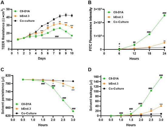 The co-culture BBB model showed efficient barrier properties. Assays were used to analyze the barrier property of bEnd.3 and C8-D1A cells seeded individually or grown in co-culture conditions. (A) Transendothelial electrical resistance (TEER) analysis using chopstick electrodes to record resistance across the transwell membrane grown with bEnd.3, C8-D1A cells or co-cultured. (B) Fluorescein isothiocyanate (FITC) dextran permeability assay was used to analyze the barrier capacity of the in vitro BBB model. (C) Solvent persistence and (D) solvent leakage tests were used to measure how long bEnd.3, C8-D1A, and co-cultured cells can hold the media on the apical side of the transwell. All data had a sample size of three (n = 3) and three experimental repeats. Data are presented as mean ± SEM. The mono-culture models were compared to the co-culture models (* bEnd.3, # C8-D1A). p < 0.05 was considered to be statistically significant. *;# p < 0.05, **;## p ≤ 0.01 and ***;### p ≤ 0.001.