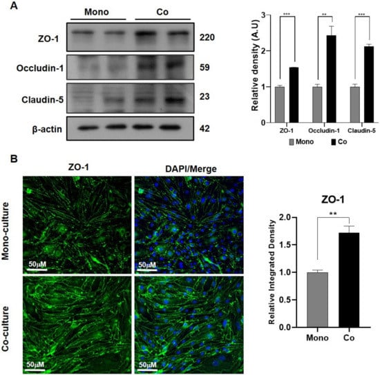 Brain endothelial cells in co-culture showed enhanced tight junction protein expression. (A) Immunoblot analysis was used to compare the expression levels of the tight junction proteins ZO-1, occludin-1, and claudin-5 protein in bEnd.3 cells between the monolayer and in the co-culture along with C8-D1A cells. (B) Immunofluorescence staining was used to analyze ZO-1 expression in bEnd.3 cells cultured in mono- and co-culture states. All data had a sample size of three (n = 3) and three experimental repeats. Data are presented as mean ± SEM. p < 0.05 was considered to be statistically significant. ** p ≤ 0.01 and *** p ≤ 0.001.
