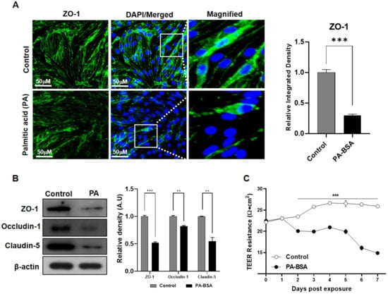 PA-BSA affects the expression of tight junction proteins. (A) Confocal microscope images show the co-expression of ZO-1 in bEnd.3 cells in the control and the bovine serum albumin-conjugated palmitic acid (PA-BSA)-treated group. (B) Immunoblot analysis was used to compare the expression levels of tight junction proteins ZO-1, occludin-1, and claudin-5 expressed in bEnd.3 cells from the control and PA-BSA-treated group. (C) TEER resistance values were measured across the co-cultured transwell membrane of the control group and PA-BSA-treated group. All data had a sample size of three (n = 3) and three experimental repeats. Data are presented as mean ± SEM. p < 0.05 was considered to be statistically significant. ** p ≤ 0.01 and *** p ≤ 0.001.