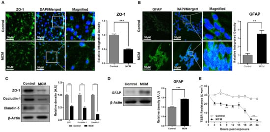 Neuroinflammation includes the microglial activation responsible for the secretion of interleukins and cytokines. To mimic this condition, our co-cultured model was exposed to microglial conditioned media (MCM), which is enriched with pro-inflammatory interleukins and cytokines. After 24 h of exposure, the immunofluorescence analysis showed that ZO-1 expression declined and glial fibrillary acidic protein (GFAP), a marker of astroglial injury, expression significantly increased in the MCM-treated group, as compared to the control group (Figure 5A,B). We validated this finding through western blot analysis and showed that the expression of tight junction proteins after MCM exposure significantly declined, while GFAP expression increased compared to the non-exposed control group (Figure 5C,D). Lastly, BBB integrity was analyzed using TEER analysis and showed a rapid decline in barrier capability after exposure to MCM (Figure 5E).