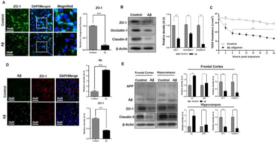 An in vitro model for AD-like pathology with three co-cultured cell lines was created with bEnd.3 cells that were seeded on the apical side of the transwell, C8-D1A cells that were seeded on the basolateral side of the same transwell, and HT22 cells that were seeded in the wells of the plate. HT22 cells were transfected with the amyloid precursor protein overexpression plasmid pCAX APPswe/ind or exposed to Aβ (1–42) peptides dissolved in culture media for TEER analysis to detect the role of Aβ toxicity. The ZO-1 expression level in the mono-cultured model showed a significant decrease in the number of cells exposed to Aβ compared to the control (Figure 6A). Furthermore, tight junction proteins in the mono-cultured model revealed that ZO-1, claudin-5, and occludin-1 protein expression levels were significantly down-regulated (Figure 6B). In the co-cultured model exposed to Aβ, the TEER analysis also showed a rapid decline in barrier capability (Figure 6C) and the fluorescent immunohistochemistry results demonstrated the same finding that the tight junction protein expression significantly declined compared to the control (Figure 6D). These findings were further confirmed by analyzing the in vivo AD model established with a stereotaxic injection of Aβ1–42 in C57BL/6N mice. The Western blot analysis of the frontal cortex and hippocampal region of Aβ-injected mice showed that the ZO-1 protein expression level was comparably lower than the control (Figure 6E). Aβ co-localized in specific brain regions, which confirmed Aβ’s toxicity, together with the tight junction protein expression levels observed in the Aβ-induced AD model.