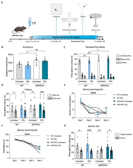 PEL24-199 restores short- and long-term spatial memory in APP/PS1 mice. (A) Time representation of APP/PS1 mice treatment and behavioral testing. The mice were treated for four months starting at eight months old, with 1 mg/kg of PEL24-199. Behavioral tests (Actimetry, Elevated Plus Maze, Y-Maze, and Barnes test) were performed at eleven months old, and the mice were sacrificed at twelve months old. (B) Locomotion and motricity tests of untreated versus PEL24-199-treated WT and APP/PS1 animals. Histograms represent the means ± SEM of the distance moved during 10 min. (C) Anxiety test of untreated versus PEL24-199-treated WT and APP/PS1 animals. Histograms represent the means ± SEM of the time spent in the open arms (triangle) versus the closed arms (dots and hatched bars). (D) Short-term memory test of untreated versus PEL24-199-treated WT and APP/PS1 animals. Histograms represent the means ± SEM of the time spent in the new arm (triangle) versus the other arm (dots and hatched bars). (E,F). Learning phase of the long-term memory test between Day one and Day four of untreated versus PEL24-199-treated WT and APP/PS1 animals, as indicated by the total latency and the number of total mistakes needed to find the target hole. (G). Long-term spatial memory was assessed 72 h after the last day of the learning phase. Results represent the percentage of time spent in the target quadrant versus non-target quadrants (others). WT mice (both treated with water or PEL24-199) spent significantly more time in the target quadrant, indicative of a preserved spatial memory. While APP/PS1 mice exhibited spatial memory deficits, as underlined by their lack of preference for the target quadrant, PEL24-199-treated APP/PS1 mice behaved as WT mice, suggesting that the treatment rescued the memory impairment. * p < 0.05, ** p < 0.01, *** p < 0.001, **** p < 0.0001, and ns as not significant. using Two-way ANOVA; n = 8–12 per group.