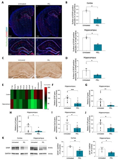 In PEL24-199-treated APP/PS1 animals, the percentage of surface in the cortex and hippocampus covered by GFAP-positive astrocyte staining was significantly reduced by more than half when compared to untreated animals (Figure 3B). Likewise, immunohistological staining revealed a significant decrease in the percent area covered by activated astrocytes in the hippocampus of APP/PS1 mice treated with PEL24-199 (Figure 3C,D). The GFAP staining alone is not sufficient to ascertain the reactivity of astrocytes. Therefore, we used qPCR to investigate the additional astrocytic markers reported to be increased in reactive astrocytes [39], together with several microglial activation markers. We showed that most of the markers were significantly decreased in the cortex of PEL24-199 treated animals compared to untreated APP/PS1 mice. However, the most significant changes were observed in the hippocampus, in which ten out of the eleven markers tested were decreased, among which five were significantly reduced (Figure 3E). GFAP mRNA was also significantly decreased, as were two other reactive astrocytes secreted protein transcripts, C3 and Lcn2 (Figure 3F–H). Moreover, two microglia markers of neuroinflammation, TLR2, and Clec7a [40,41] were also significantly reduced in animals treated with PEL24-199 (Figure 3I,J). Following the previous results obtained, GFAP protein levels were also decreased both in the hippocampus and in the cortex of APP/PS1 mice treated with PEL24-199 (Figure 3K,L). Overall, our results suggest that astrogliosis and microglial gene activation in APP/PS1 mice are significantly reduced by curative PEL24-199 treatment, and both processes might contribute to the rescue of the amyloid pathology and memory impairment in our PEL24-199-treated APP/PS1 mice.