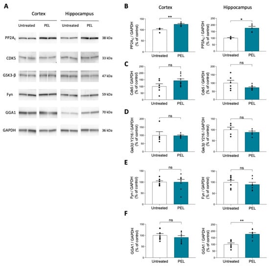 Indeed, a four-month treatment sharply increased the expression of the catalytic subunit PP2AC in the hippocampus and the cortex of the animals (Figure 4B), following the obtained results of the tauopathy model. We then investigated the protein level of kinases Cdk5 and GSK3β, involved in Tau [43,44,45] and APP hyperphosphorylation [46,47] and associated pathologic changes. Cdk5 and GSK3β protein levels remain unchanged both in the hippocampus and the cortex of APP/PS1 mice treated with PEL24-199 (Figure 4C,D). This suggests that kinase expression is not modified by the PEL24-199 treatment. The expression of Fyn protein kinase, which has been linked to Aβ synaptic toxicity and Tau phosphorylation [45,48], was also investigated. The protein levels of Fyn were unchanged under PEL treatment conditions (Figure 4E).