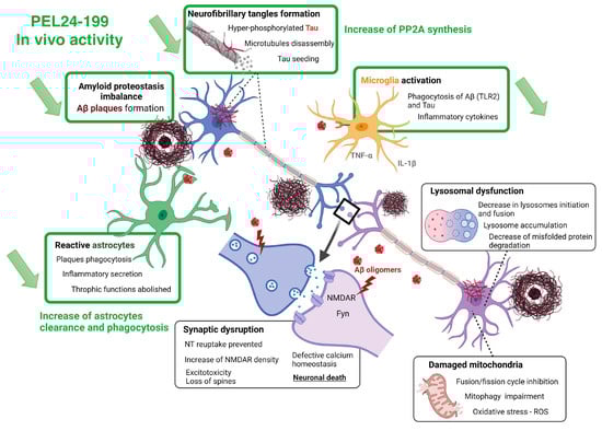 Our results show that a curative treatment of APP/PS1 mice with PEL24-199 restores short- and long-term memory and alleviates the amyloid pathology in this mouse model, as summarized in Figure 5. We show that this rescuing effect is accompanied by reduced astrogliosis and neuroinflammation and an increase in PP2AC expression levels. However, limitations of the present study relate to limited mechanistic information providing a potential relationship between PEL24-199 cell activity and the in vivo effect against both lesional processes of AD. Although alkalizing or lysosomotropic properties appear dispensable, the mechanism related to BACE1 modulatory inhibition would need further investigation to exclude a yet undetermined and unrelated mechanism targeted by PEL24-199. Overall, these results demonstrate the promising potential of small molecules in an astrocytes-mediated pharmacological intervention strategy that could improve AD deficits even after the onset of the symptomatic phase of the disease.