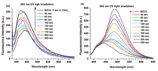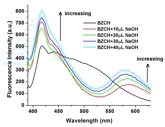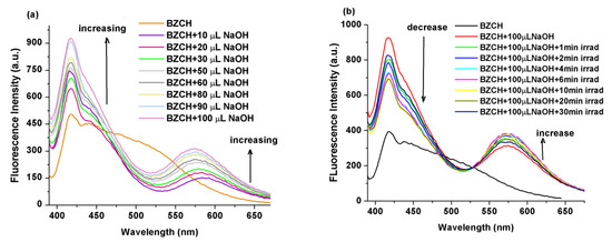 2.3. Fluorescence Intensity Modulation by Addition of NaOH and Followed by UV Light Irradiation