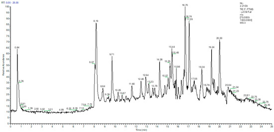 The total ion current (TIC) chromatogram obtained for the separation of targeted phenolic compounds from extra-virgin olive oil liquid extract using UHPLC–MS/MS detection in negative ionization mode.