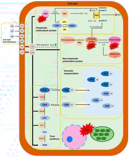 The protection of cells against heavy-metal-induced oxidative stress can occur via non-enzymatic antioxidant systems (Figure 2). Non-enzymatic antioxidants include hydrophilic (ascorbate, glutathione), lipophilic (α-tocopherol and carotenoids), phenolic, and flavonoid small molecules.