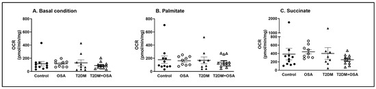Oxygen consumption rate and substrate utilization in skeletal muscle biopsies. The oxygen consumption rate (OCR) in the muscle biopsies was measured using a respirometry chamber. Initially, the biopsy homogenate was supplemented with 1 mM malate + 1 mM ADP to evaluate the baseline OCR, defined mainly by the utilization of intracellular substrates (A). Subsequently, 0.04 mM palmitoyl carnitine was administered to assess lipid oxidation capacity (B), and 10 mM succinate was added to provide an unlimited substrate for mitochondrial complex II, thus maximizing mitochondrial respiration (C). Control (nondiabetic persons without sleep apnea syndrome), OSA (nondiabetic persons with severe sleep apnea syndrome), T2DM (type 2 diabetes mellitus patients without severe sleep apnea syndrome), and T2DM + OSA (type 2 diabetes mellitus patients with severe sleep apnea syndrome). Data are presented as individual values and error bars displaying the mean ± SEM; an ANOVA test was performed to assess differences between the groups.