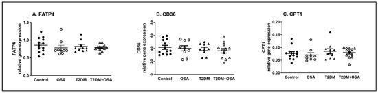 The gene expression analysis of the skeletal muscle biopsies focused on the genes coding for the FATP4, CD36, and CPT1 proteins. No differences between the groups were detected in the relative gene expression of (1) FATP4 (0.86 ± 0.06, 0.8 ± 0.07, 0.82 ± 0.05, and 0.79 ± 0.03 for control, OSA, T2DM, and T2DM + OSA groups, respectively, all p > 0.05), (2) CD36 (41.6 ± 3.1, 40.1 ± 4.0, 39.1 ± 2.7, and 36.3 ± 3.4, for control, OSA, T2DM, and T2DM + OSA groups, respectively, all p > 0.05), and (3) CPT1 (0.076 ± 0.007, 0.070 ± 0.008, 0.085 ± 0.010, and 0.080 ± 0.006, for the control, OSA, T2DM, and T2DM + OSA groups, respectively, all p > 0.05). CPT1 expression was negatively associated with Sg (r = −0.169, p < 0.05) and GEZI (r = −0,237, p < 0.05), while no association was observed between the gene expressions of FATP4, CD36, or CPT1 and the anthropometric, sleep-related, and biochemical variables. The results are shown in Figure 3A–C.