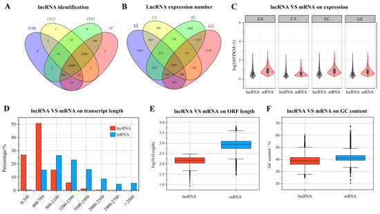 Screening, identification, and expression of lncRNA during somatic embryogenesis of garlic. The coding potential of lncRNA was analyzed by CPC2, PLEK, CPAT and SP (A); comparison of lncRNA specificity at different stages of somatic embryogenesis (B); lncRNA and mRNA expression abundance comparison (C); lncRNA and mRNA transcript length comparison (D); lncRNA and mRNA ORF length comparison (E); comparison of lncRNA and mRNA GC content (F).