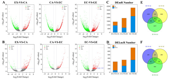 To investigate the function of DE lncRNAs, RIblast was used to predict the trans-regulatory target genes of lncRNAs (Table S2). Among the potential mRNA target genes of DE lncRNAs, there were 95 DE mRNA target genes in EX-VS-CA (37 up-regulated and 58 down-regulated), 168 DE mRNA target genes in CA-VS-EC (47 up-regulated and 121 down-regulated), 421 DE mRNA target genes in EC-VS-GE (136 up-regulated and 285 down-regulated) (Table S3). In order to further clarify the functions of lncRNAs, Gene Ontology (GO) was used to annotate the DE target mRNA genes. The results showed that DE target mRNAs in different stages (EX-VS-CA, CA-VS-EC, and EC-VS-GE) were enriched in biological processes, cellular components, and molecular functions. In the biological process category, it is mainly concentrated in the metabolic process, biological regulation, and stress response (Figure 4). In the cell component category, it is mainly enriched in cells and cell components (Figure 4). In the molecular function category, it is mainly enriched in catalytic activity and binding (Figure 4).