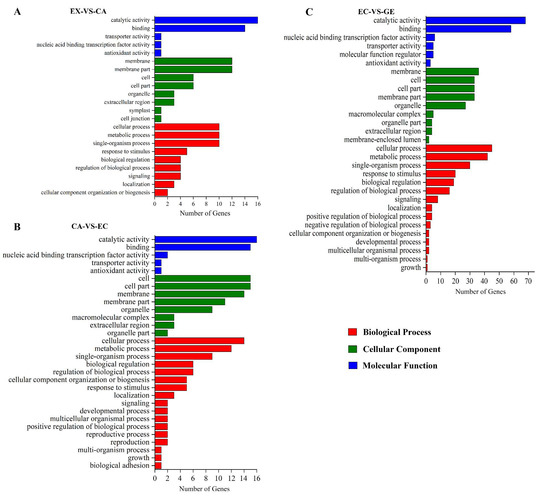 Gene Ontology analysis of potential DE mRNA target genes of lncRNA. (A–C) were gene ontology analyses of potential DE mRNA target genes of lncRNA in EX-VS-CA, CA-VS-EC, and EC-VS-GE stages, respectively; red bars indicated a biological process; green bars indicated the cell component; blue bars indicated the molecular function.
