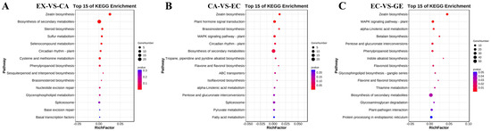 KEGG analysis of potential DE mRNA target genes of lncRNA. (A–C) represent the KEGG enrichment pathway maps of DE mRNA target genes of DE lncRNA in EX-VS-CA, CA-VS-EC, and EC-VS-GE stages, respectively.