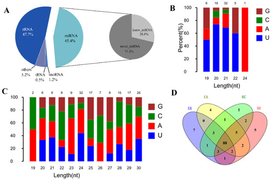 Screening, identification, and expression analysis of miRNA during garlic somatic embryogenesis. Small RNA classification and proportion (left), known and newly identified microRNA proportion (right) (A); the first base bias map of known miRNAs and newly identified miRNAs (B,C); comparison of specific expression of miRNA in different stages of somatic embryogenesis (D).