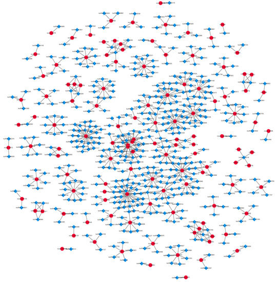 Some lncRNAs can form miRNA precursors through intracellular cleavage. In order to predict whether lncRNA is a miRNA precursor, blast software was used to compare lncRNA and miRNA precursors (lncRNA with a matching rate of ≥90% was selected as an miRNA precursor). In order to predict whether lncRNA is the target gene of miRNA, lncRNA and miRNA data were submitted to psRNATarget (Expect ≤ 4) to predict the target gene of miRNA. TAPIR through an online website (www.bioinformatics.psb.ugent.be/webtools/tapir/) (accessed on 6 June 2022) predicted whether lncRNAs trap targets for miRNAs endogenous analog (eTMs). Cytoscape (v3.5.1) software was used to generate network diagrams of the relationships between lncRNAs and related microRNAs and mRNAs.