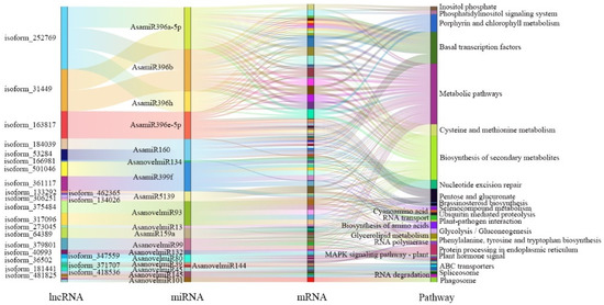 The expression levels of mRNA and lncRNA in each sample were determined using the PowerUpTM SYBRTM Green Master Mix kit. The miRNA expression level was concurrently determined in each sample by stem-loop RT-qPCR. AsBES was used as the internal reference gene. The relative expression level of genes was calculated using the Change 2−ΔΔCt method.