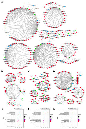 Construction of ceRNA network during garlic somatic embryogenesis. ceRNA Network during Somatic embryogenesis (some important nodes) (A); DE lncRNA–DE miRNA–DE mRNA networks of EX-VS-CA, CA-VS-EC, and EC-VS-GE stages, respectively (B–D); KEGG analysis of DE mRNA at EX-VS-CA, CA-VS-EC, and EC-VS-GE stages, respectively (E–G). Note: the blue diamond is lncRNA; the red circle is mRNA; the green triangle is miRNA.