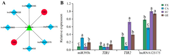miR393s-ceRNA network and its related genes were verified by RT-qPCR. lncRNAs-miR393s-TIR network (A); miR393h-ceRNA network RT-qPCR validation (B). Lowercase letters indicate a significant difference at the 0.05 level (ANOVA analysis).