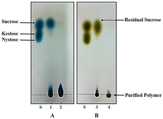 Thin layer chromatography analysis of the exopolysaccharide products synthesized by L. gasseri DSM 20604 (A) and W. cibaria M3b (B). 1: Inulin containing broth of L. gasseri culture; 2: Purified inulin. 3: Dextran containing broth of W. cibaria culture; 4: Purified dextran.