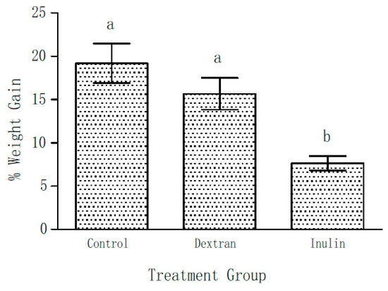 As already mentioned, the body weights of all the mice of three groups were determined on Day 0 and Day 21 of the experiment. Figure 2 shows the weight gain as percentage of their initial body weights during the course of this experiment on supplementation with EPS (5% w/w) in their feed. The initial weights among the groups were not significantly different. After 21 days of feeding, 19 ± 2.3% gain in total body weight was observed in the control group. On the contrary, only 7.6 ± 0.8% weight gain was observed in the inulin fed mice group. Though weight gain in the dextran group was not considered statistically significant (p < 0.05), it showed a lower (15.7 ± 1.8%) trend in comparison with the control group.