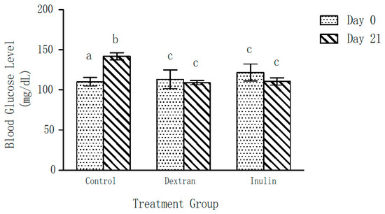 Blood glucose levels of the control group of mice showed a significant increase (22 ± 5%) over a period of 21 days (Figure 3). Contrarily, no significant change in the blood glucose levels of the experimental groups was observed after 21 days of feeding on dextran- or inulin-supplemented feed, as compared to those on Day 0. Further, the blood glucose levels of both experimental groups were found to be significantly lower than those of the control group at the end of the experiment (day 21).