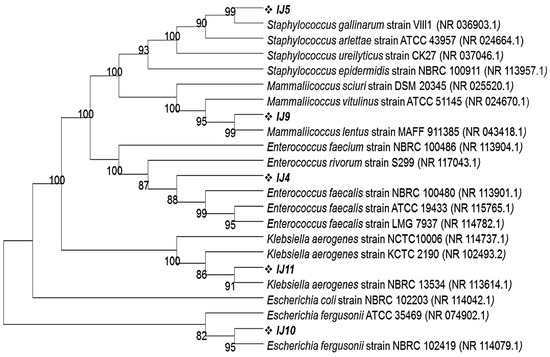 All morphologically distinct colonies from each plate were selected, purified and subjected to DNA extraction followed by 16S rRNA gene sequencing. Each bacterial colony’s 16S rRNA gene was PCR amplified using FD1 and RP1 primers, producing a 1500 bp-sized product. The Blastn program, offered by NCBI, was used to analyze the sequencing data of the PCR-amplified genes and reveal their percentage identity with other closely related strains. According to these results, the turquoise blue colony (labelled as IJ4) from the control group exhibited 100% identity with Enterococcus faecalis strain NBRC 100481 whereas the golden opaque (labelled as IJ5), light blue (Labelled as IJ9) and metallic blue (labelled as IJ11) colored colonies from the control group showed 99.8%, 99.9% and 99.68% identity with Staphylococcus gallinarum strain VIII1, Mammaliicoccus lentus strain MAFF 911385 and Klebsiella aerogenes strain NBRC 13534, respectively. The Blastn of the 16S rRNA gene for pink colored colonies from experimental groups showed that these colonies were 99.49% identical with Escherichia fergusonii strain NBRC 102419. This homology was further confirmed through phylogenetic analysis by phylogenetic tree that was constructed using the MEGA11 program employing neighbor joining algorithm. All of the isolates share their cluster with most identical strains as depicted by Blastn results (Figure 4).