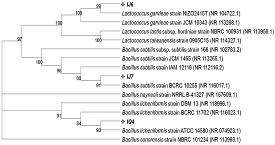 Using 16S rRNA gene sequence homology, isolates from MRS agar plates inoculated with intestinal fluids from dextran and Inulin-fed groups were also identified. According to Blastn results, the intestinal fluid of these mice contained three different types of bacteria in a dominant proportion labeled as IJ6, IJ7 and IQ4 having 98.11%, 99.80% and 98.64% homology with Lactococcus garvieae strain NIZO2415T, Bacillus subtilis strain BCRC 10255 and Bacillus licheniformis strain ATCC 14580, respectively. The phylogenetic analysis revealed that these microbes cluster closely with the above said respective closely related bacterial species (Figure 5). All the 16S rRNA gene sequences obtained in this study were submitted to NCBI and their accession numbers were obtained as given in Table 3.