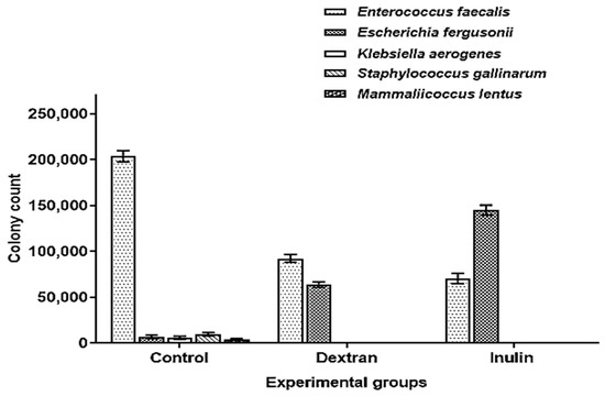 The comparative analysis of culturable microbial populations among different treatment groups showed that the population of Enterococcus was significantly inhibited down to 59% and 65% in intestinal fluids of dextran and inulin-fed mice, respectively, as compared to the control. Similarly, the release of intestinal E. fergusonii population in dextran and inulin-fed mice enhanced their levels up to 89% and 95%, respectively, as compared to the control. The occurrence of a significant population of E. fergusonii in intestinal mucosa samples of the control also showed that both polymers trigger the detachment and release of E. fergusonii from the intestinal epithelial cells. The populations of K. aerogens, S. gallinarium and M. lentus were completely inhibited in the experimental groups demonstrating the effectiveness of microbially derived exopolysaccharides in maintaining gastrointestinal health by inhibiting the growth of enteric pathogens (Figure 6). The statistical analysis also revealed a significant difference in the number of colony forming units (CFU) of Enterococcus and E. fergusonii in dextran and inulin-fed groups as compared to the control (Table 4).