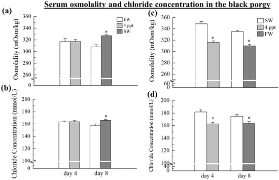 Analysis of the serum osmolality (a,c) and chloride concentrations (b,d) in black porgy on day 4 and 8 (n = 9, in each group). The results are expressed as the mean ± SEM (standard error of the mean). Asterisks (*) indicate significant differences (p < 0.05) between control and treated groups.